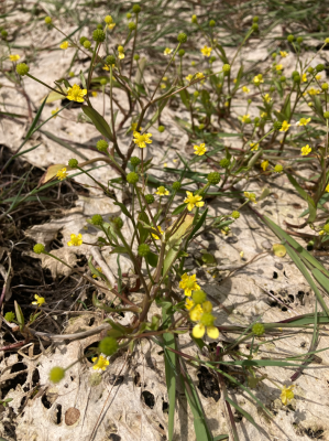 Sous une belle journée ensoleillée, l’équipe de botanistes a pu faire de nombreuses et belles observations. Sur les dunes et leurs sentiers : le Trèfle raide (Trifolium strictum), Petite centaurée maritime (Centaurium maritimum), la Linaire de Pélissier (Linarium pelisseriana)… Dans de petites dépressions humides ont pu être observées la Renoncule à feuilles d’ophiglosse (Ranunculus ophioglossifolius), protégée au niveau national ou encore le Jonc pygmée (Juncus pygmaeus).